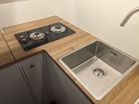 Die Sitzbank kann zu einem großen Bett mit einer Liegefläche von 1,60 x 1,90m umgebaut werden (Querschläfer) und durch das optionale Aufstelldach finden bis zu vier Personen Platz.